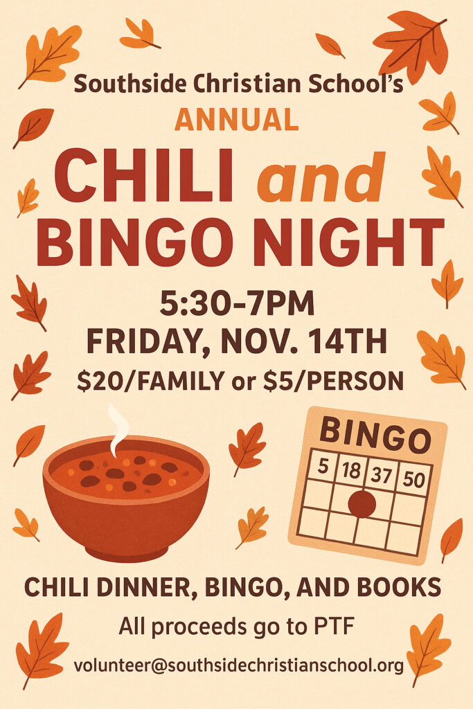 Warm up your November with some delicious chili and games for the whole family while supporting Southside Christian School through our Annual Chili and Bingo Night!